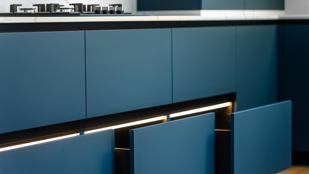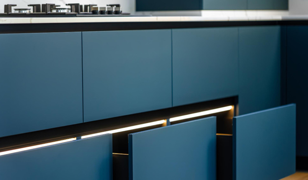 Apgaismojums mēbeļu iekšpusē nav tikai elements dekorēšanas dēļ. Tas padara telpu ērtu un pārskatāmu, īpaši vietās, kur svarīga katra detaļa. Garderobē jūs pārredzat apģērbu, nevis akli taustaties ēnā. Virtuvē varat uzreiz paņemt vajadzīgo, bez lieka apžilbinājuma acīs. Viss darbojas precīzi jūsu ērtībām.
